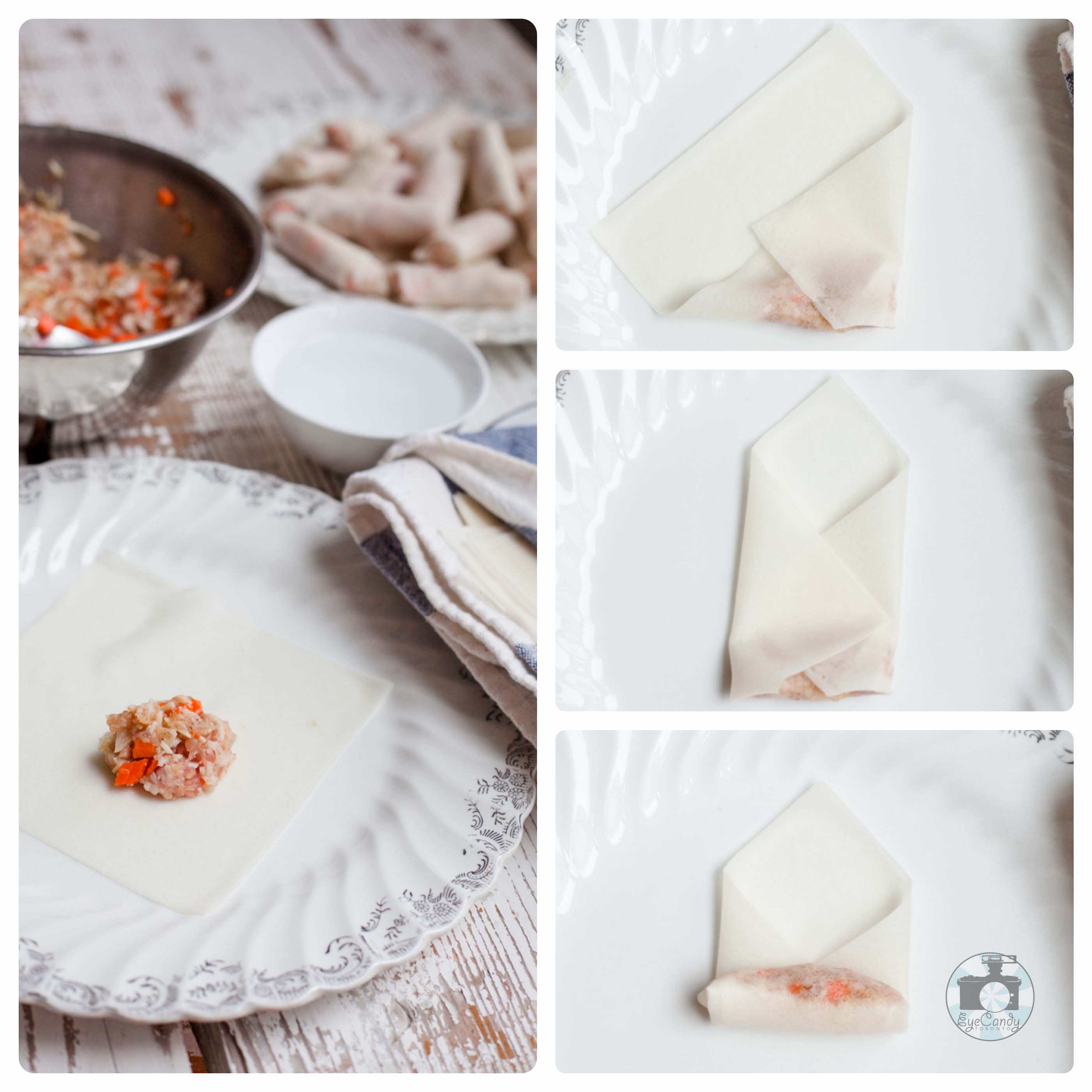To wrap the chilled filling, take a spring roll pastry and position it in diamond orientation. Place about a teaspoonful on one end and fold the lower edge away from you, making sure the fold snuggly secures the filling. Take the left and the right sides and fold. The spring roll should be able to turn and wrap itself with the wrapper about 3 times over. This would ensure that the spring roll would not unravel as it is being fried. Chill the spring rolls for about 30 min before frying to avoid moisture from spattering in the hot oil. Heat the cooking oil to 350F in a shallow pan enough to submerge the spring rolls. Fry the lumpia for 10 minutes and drain in paper towels after.