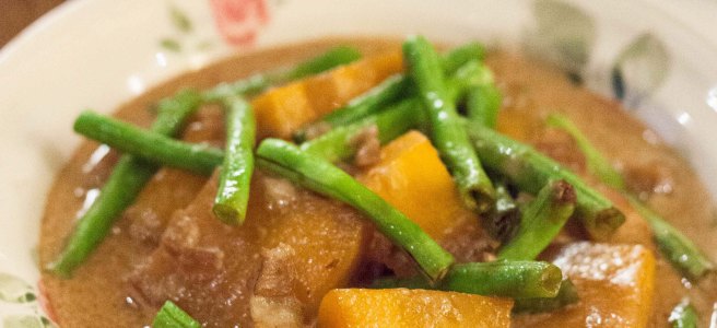 Just like any kid, I used to pout secretly when the dinner was something vegetable. It was a staple then to pair fried fish with vegetables as it is cheap and nutritious. But I didn’t mind much when it was a dish with squash. I actually find it comforting. It can just be squash simply sautéed (ginisa) with onions, garlic and seasoned with Filipino soy sauce and I am all set. I found out later that there was a better version, one that was the squash mixed in with long beans and swimming in creamy coconut milk. The velvety texture of the coconut milk marries perfectly with the sweetness of the squash and beans, this is definitely one of my comfort foods.